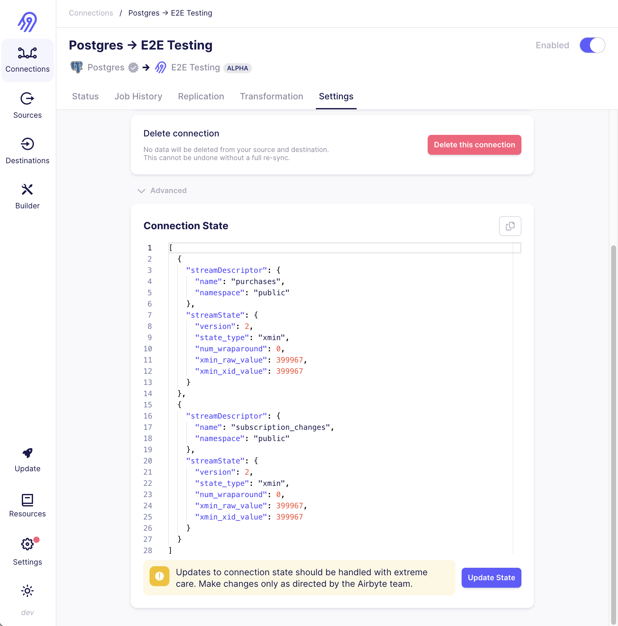 Settingstab. Open theAdvancedsettings to see the connection state (which manages incremental syncs). Copy the state to your clipboard.